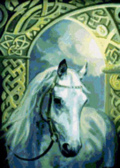 Ориентировочно так, схема вышивки «Легенда», созданная автором Karel, будет выглядеть при отшиве на канве. Размер данной вышивки равен 136x190 крестов, при этом используется 64 цветов. Ключевые слова, по которым можно найти эту схему: конь, лошадь, животные. Также, вы можете взглянуть на оригинальную картинку, соответствующую данной схеме вышивки.