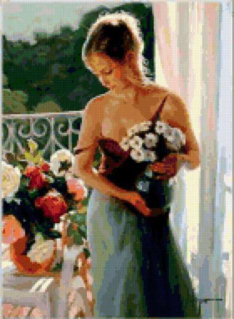 Ориентировочно так, схема вышивки «Леди», созданная автором Svetla_Nochka, будет выглядеть при отшиве на канве. Размер данной вышивки равен 140x190 крестов, при этом используется 83 цветов. Ключевые слова, по которым можно найти эту схему: человек, люди, девушка, леди, мисс, пейзаж, нежность, цветы, цветок. Также, вы можете взглянуть на оригинальную картинку, соответствующую данной схеме вышивки.