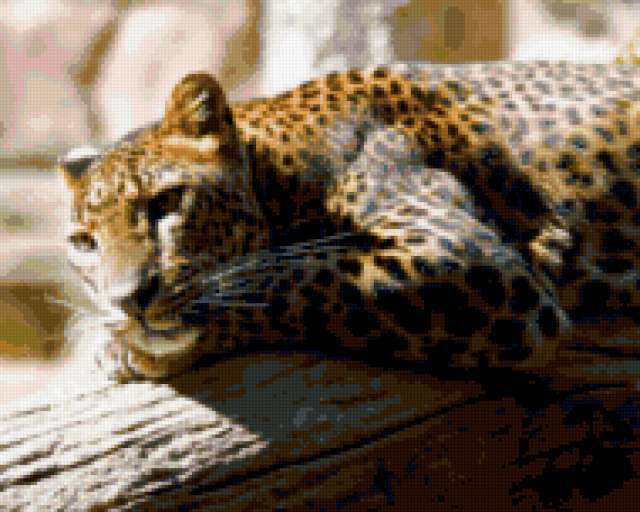 Ориентировочно так, схема вышивки «Леопард», созданная автором vuv24, будет выглядеть при отшиве на канве. Размер данной вышивки равен 190x152 крестов, при этом используется 70 цветов. Ключевые слова, по которым можно найти эту схему: кошка, кот, животные, леопард. Также, вы можете взглянуть на оригинальную картинку, соответствующую данной схеме вышивки.