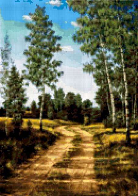 Ориентировочно так, схема вышивки «Лесная дорога», созданная автором lucha, будет выглядеть при отшиве на канве. Размер данной вышивки равен 130x184 крестов, при этом используется 70 цветов. Ключевые слова, по которым можно найти эту схему: лес, лето, дорога. Также, вы можете взглянуть на оригинальную картинку, соответствующую данной схеме вышивки.