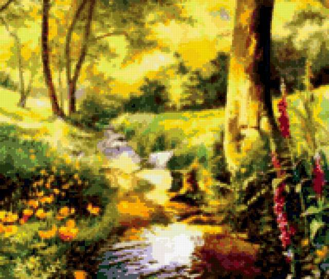 Ориентировочно так, схема вышивки «Лесной ручей», созданная автором rybka6, будет выглядеть при отшиве на канве. Размер данной вышивки равен 190x161 крестов, при этом используется 67 цветов. Ключевые слова, по которым можно найти эту схему: пейзаж, природа, картина, живопись, искусство, лето, река, в лесу. Также, вы можете взглянуть на оригинальную картинку, соответствующую данной схеме вышивки.