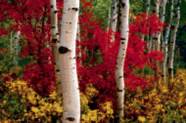 Ориентировочно так, схема вышивки «Лес», созданная автором Elena_, будет выглядеть при отшиве на канве. Размер данной вышивки равен 190x126 крестов, при этом используется 72 цветов. Ключевые слова, по которым можно найти эту схему: пейзаж, лес, деревья, осень. Также, вы можете взглянуть на оригинальную картинку, соответствующую данной схеме вышивки.