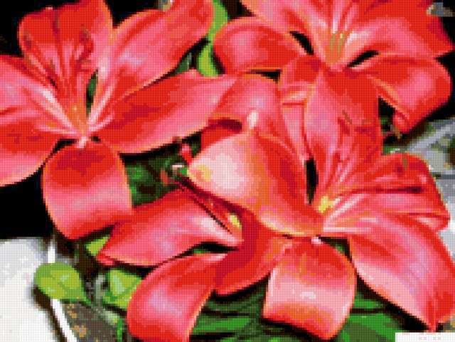 Ориентировочно так, схема вышивки «Лилии», созданная автором Nastasi6, будет выглядеть при отшиве на канве. Размер данной вышивки равен 190x143 крестов, при этом используется 58 цветов. Ключевые слова, по которым можно найти эту схему: цветок, растение, лилия, природа, букет. Также, вы можете взглянуть на оригинальную картинку, соответствующую данной схеме вышивки.