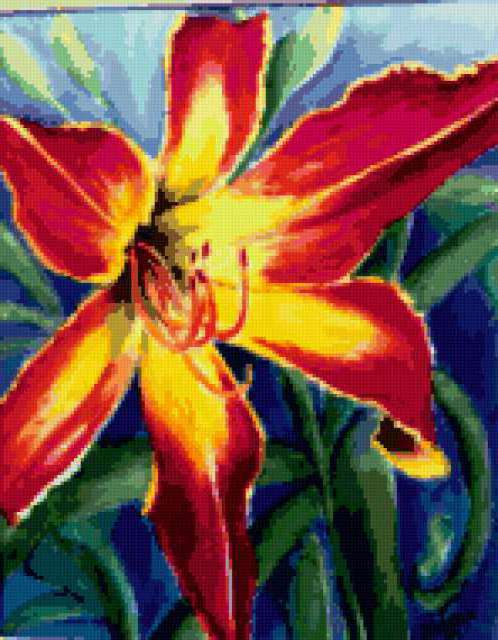 Ориентировочно так, схема вышивки «Лилия», созданная автором eldi_22, будет выглядеть при отшиве на канве. Размер данной вышивки равен 148x190 крестов, при этом используется 68 цветов. Ключевые слова, по которым можно найти эту схему: лилия, цветы. Также, вы можете взглянуть на оригинальную картинку, соответствующую данной схеме вышивки.