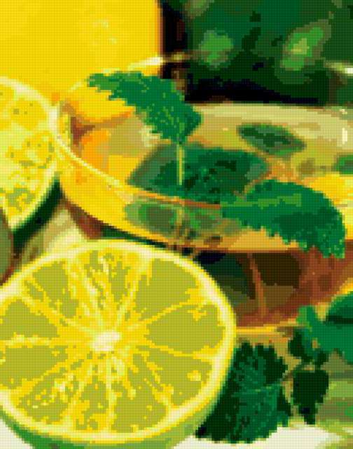 Ориентировочно так, схема вышивки «Лимон», созданная автором M-IraJ, будет выглядеть при отшиве на канве. Размер данной вышивки равен 130x165 крестов, при этом используется 54 цветов. Ключевые слова, по которым можно найти эту схему: еда, цитрус, лимон. Также, вы можете взглянуть на оригинальную картинку, соответствующую данной схеме вышивки.