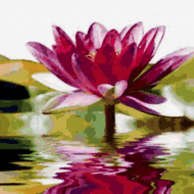 Ориентировочно так, схема вышивки «Лотос», созданная автором Eddy, будет выглядеть при отшиве на канве. Размер данной вышивки равен 190x190 крестов, при этом используется 57 цветов. Ключевые слова, по которым можно найти эту схему: подушка, красные цветы, лотос. Также, вы можете взглянуть на оригинальную картинку, соответствующую данной схеме вышивки.