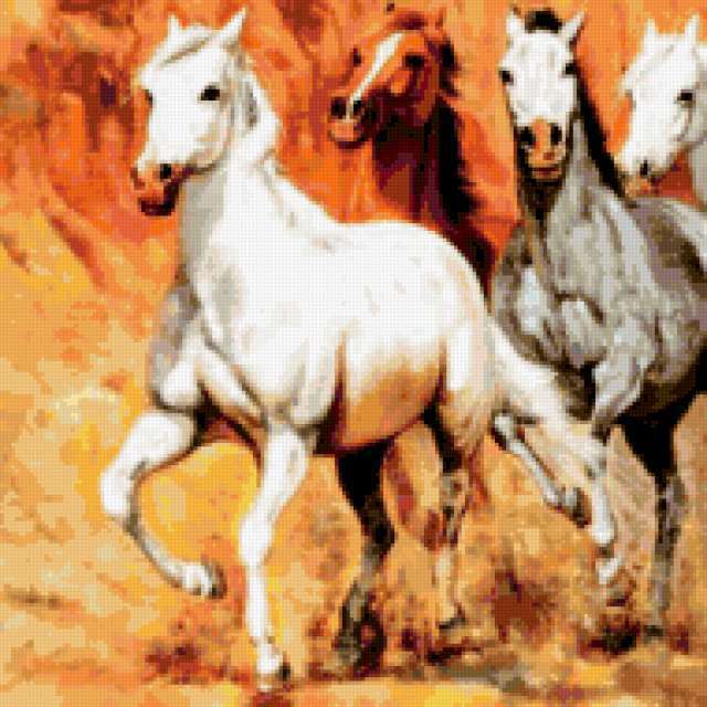 Ориентировочно так, схема вышивки «Лошади», созданная автором vesnyshka63, будет выглядеть при отшиве на канве. Размер данной вышивки равен 190x190 крестов, при этом используется 69 цветов. Ключевые слова, по которым можно найти эту схему: живопись, животные, лошади. Также, вы можете взглянуть на оригинальную картинку, соответствующую данной схеме вышивки.