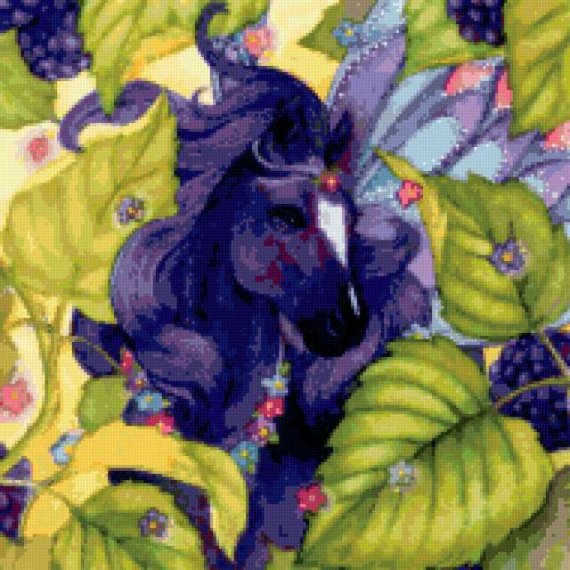 Ориентировочно так, схема вышивки «Лошадка в цветах», созданная автором emma-ia, будет выглядеть при отшиве на канве. Размер данной вышивки равен 190x190 крестов, при этом используется 71 цветов. Ключевые слова, по которым можно найти эту схему: картина, детям, сказка, лошади, подушка, фэнтези. Также, вы можете взглянуть на оригинальную картинку, соответствующую данной схеме вышивки.