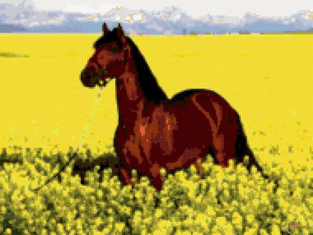 Ориентировочно так, схема вышивки «Лошадь в поле», созданная автором irina191966, будет выглядеть при отшиве на канве. Размер данной вышивки равен 190x143 крестов, при этом используется 38 цветов. Ключевые слова, по которым можно найти эту схему: лошади. Также, вы можете взглянуть на оригинальную картинку, соответствующую данной схеме вышивки.