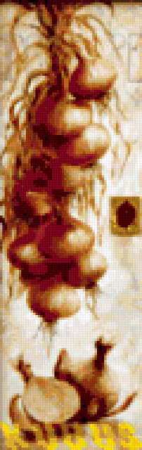 Ориентировочно так, схема вышивки «Лук», созданная автором xa00p3857, будет выглядеть при отшиве на канве. Размер данной вышивки равен 60x190 крестов, при этом используется 64 цветов. Ключевые слова, по которым можно найти эту схему: натюрморт, кухня, овощи, лук. Также, вы можете взглянуть на оригинальную картинку, соответствующую данной схеме вышивки.