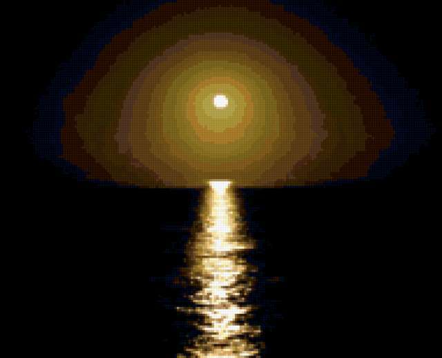 Ориентировочно так, схема вышивки «Лунная дорожка», созданная автором zima68, будет выглядеть при отшиве на канве. Размер данной вышивки равен 190x154 крестов, при этом используется 45 цветов. Ключевые слова, по которым можно найти эту схему: ночь, вода, река, море, дорожка, луна. Также, вы можете взглянуть на оригинальную картинку, соответствующую данной схеме вышивки.