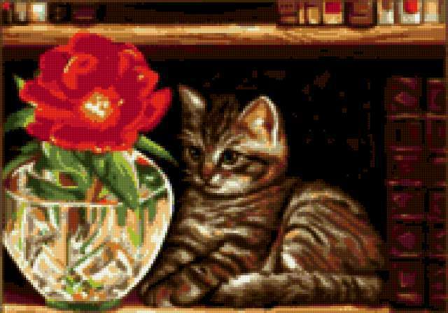 Ориентировочно так, схема вышивки «Любопытный», созданная автором VA903M, будет выглядеть при отшиве на канве. Размер данной вышивки равен 190x133 крестов, при этом используется 46 цветов. Ключевые слова, по которым можно найти эту схему: котёнок, цветок, ваза. Также, вы можете взглянуть на оригинальную картинку, соответствующую данной схеме вышивки.