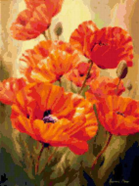 Ориентировочно так, схема вышивки «Маки», созданная автором poltanya, будет выглядеть при отшиве на канве. Размер данной вышивки равен 142x190 крестов, при этом используется 52 цветов. Ключевые слова, по которым можно найти эту схему: маки, мак, цветы, цветок, любимые маки, полевые цветы, луговые цветы, картина. Также, вы можете взглянуть на оригинальную картинку, соответствующую данной схеме вышивки.