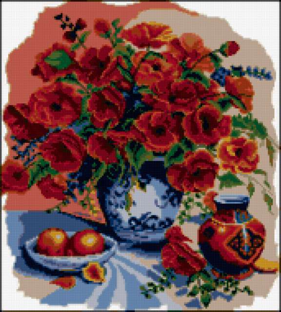 Ориентировочно так, схема вышивки «Маки», созданная автором poltanya, будет выглядеть при отшиве на канве. Размер данной вышивки равен 171x190 крестов, при этом используется 48 цветов. Ключевые слова, по которым можно найти эту схему: маки, мак, цветы, цветок, любимые маки, полевые цветы, натюрморт, букет, луговые цветы, картина. Также, вы можете взглянуть на оригинальную картинку, соответствующую данной схеме вышивки.