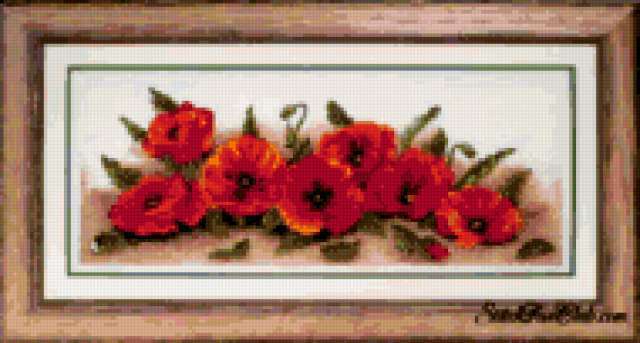 Ориентировочно так, схема вышивки «Маки», созданная автором xa00p3857, будет выглядеть при отшиве на канве. Размер данной вышивки равен 190x102 крестов, при этом используется 72 цветов. Ключевые слова, по которым можно найти эту схему: цветы, маки. Также, вы можете взглянуть на оригинальную картинку, соответствующую данной схеме вышивки.