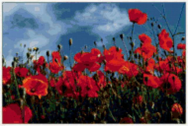 Ориентировочно так, схема вышивки «Маки», созданная автором anutka081189, будет выглядеть при отшиве на канве. Размер данной вышивки равен 190x128 крестов, при этом используется 62 цветов. Ключевые слова, по которым можно найти эту схему: маки, цветы, красное. Также, вы можете взглянуть на оригинальную картинку, соответствующую данной схеме вышивки.