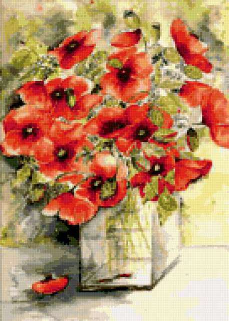 Ориентировочно так, схема вышивки «Маки», созданная автором smorodina2410, будет выглядеть при отшиве на канве. Размер данной вышивки равен 136x190 крестов, при этом используется 61 цветов. Ключевые слова, по которым можно найти эту схему: цветы, природа, лето, ваза, стол. Также, вы можете взглянуть на оригинальную картинку, соответствующую данной схеме вышивки.