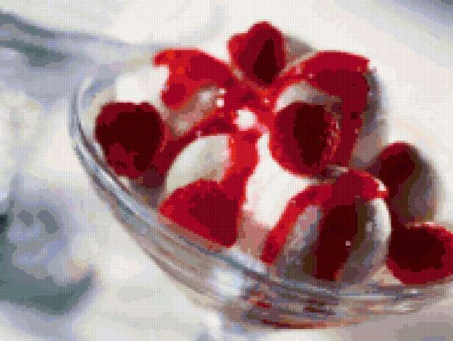 Ориентировочно так, схема вышивки «Малина», созданная автором Marisya, будет выглядеть при отшиве на канве. Размер данной вышивки равен 190x143 крестов, при этом используется 64 цветов. Ключевые слова, по которым можно найти эту схему: малина, ягоды, белое. Также, вы можете взглянуть на оригинальную картинку, соответствующую данной схеме вышивки.