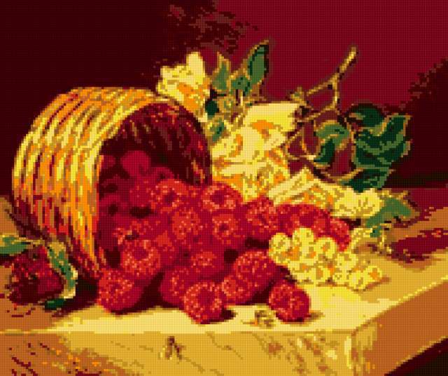 Ориентировочно так, схема вышивки «Малина», созданная автором natalia, будет выглядеть при отшиве на канве. Размер данной вышивки равен 190x160 крестов, при этом используется 19 цветов. Ключевые слова, по которым можно найти эту схему: натюрморт, ягоды, малина. Также, вы можете взглянуть на оригинальную картинку, соответствующую данной схеме вышивки.