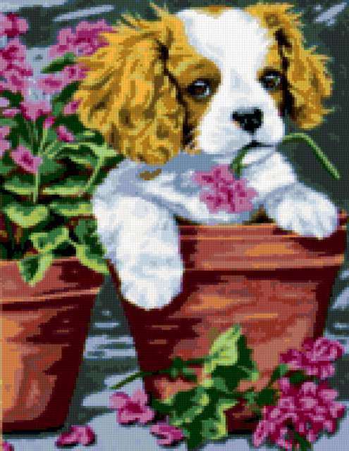 Ориентировочно так, схема вышивки «Малыш», созданная автором VA903M, будет выглядеть при отшиве на канве. Размер данной вышивки равен 147x190 крестов, при этом используется 64 цветов. Ключевые слова, по которым можно найти эту схему: щенок, цветы, собака. Также, вы можете взглянуть на оригинальную картинку, соответствующую данной схеме вышивки.