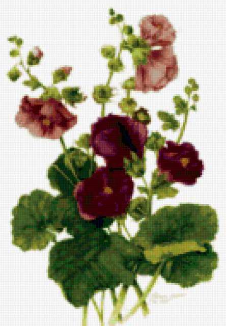 Ориентировочно так, схема вышивки «Мальва», созданная автором rabbit17, будет выглядеть при отшиве на канве. Размер данной вышивки равен 132x190 крестов, при этом используется 63 цветов. Ключевые слова, по которым можно найти эту схему: ботанический рисунок. Также, вы можете взглянуть на оригинальную картинку, соответствующую данной схеме вышивки.