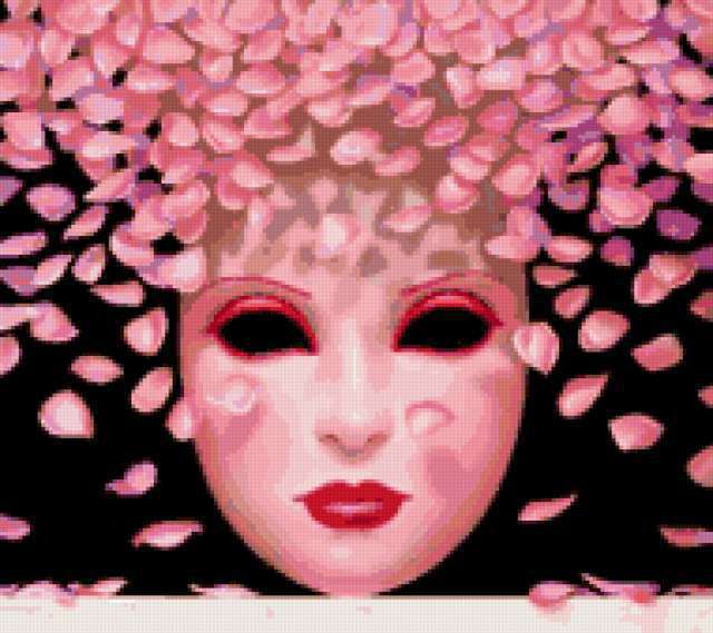 Ориентировочно так, схема вышивки «Маска в розовых лепестках», созданная автором rybka6, будет выглядеть при отшиве на канве. Размер данной вышивки равен 190x169 крестов, при этом используется 40 цветов. Ключевые слова, по которым можно найти эту схему: на чёрном, слова, буквы, маска, любовь, love, сердце, для интерьера. Также, вы можете взглянуть на оригинальную картинку, соответствующую данной схеме вышивки.