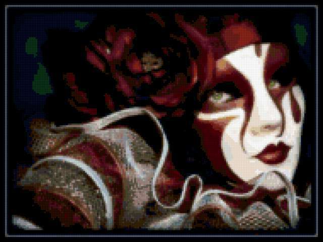 Ориентировочно так, схема вышивки «Маска», созданная автором Dalya, будет выглядеть при отшиве на канве. Размер данной вышивки равен 190x143 крестов, при этом используется 64 цветов. Ключевые слова, по которым можно найти эту схему: маска маскарад театр. Также, вы можете взглянуть на оригинальную картинку, соответствующую данной схеме вышивки.