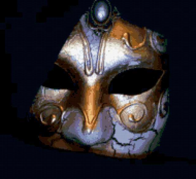 Ориентировочно так, схема вышивки «Маска», созданная автором VALKIRIA_E, будет выглядеть при отшиве на канве. Размер данной вышивки равен 190x174 крестов, при этом используется 50 цветов. Ключевые слова, по которым можно найти эту схему: маска, венеция, карнавал. Также, вы можете взглянуть на оригинальную картинку, соответствующую данной схеме вышивки.