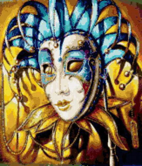 Ориентировочно так, схема вышивки «Маска», созданная автором alena4, будет выглядеть при отшиве на канве. Размер данной вышивки равен 163x190 крестов, при этом используется 43 цветов. Ключевые слова, по которым можно найти эту схему: маска, карнавал, маскарад, декор, украшение, тайна. Также, вы можете взглянуть на оригинальную картинку, соответствующую данной схеме вышивки.