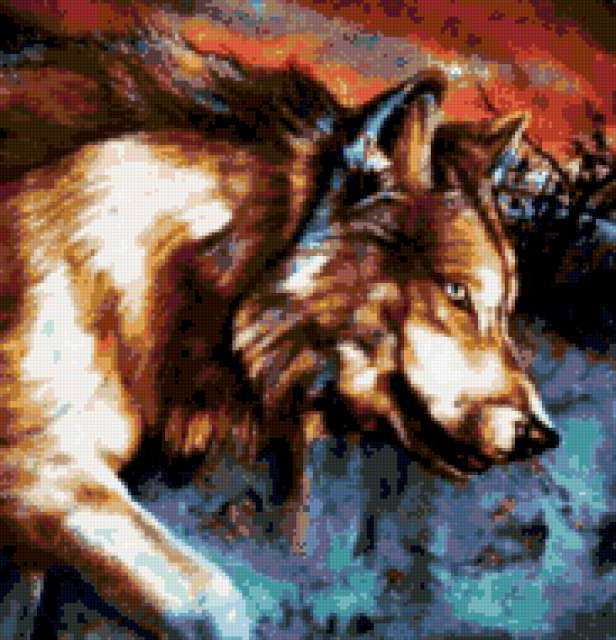 Ориентировочно так, схема вышивки «Матерый», созданная автором Marina22, будет выглядеть при отшиве на канве. Размер данной вышивки равен 183x190 крестов, при этом используется 53 цветов. Ключевые слова, по которым можно найти эту схему: животные, волк. Также, вы можете взглянуть на оригинальную картинку, соответствующую данной схеме вышивки.