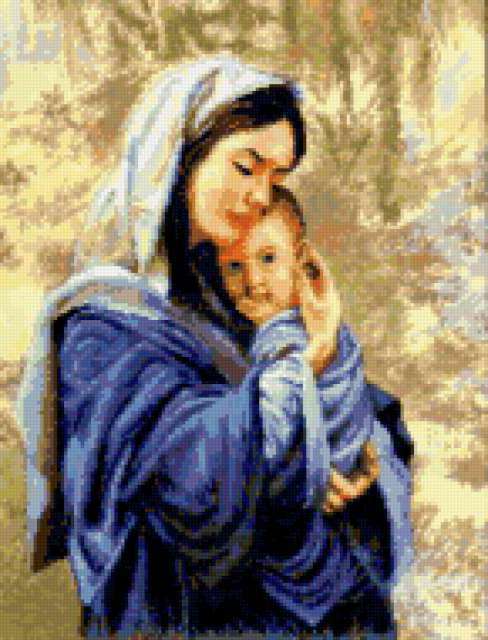 Ориентировочно так, схема вышивки «Мать и дитя», созданная автором tolkusha, будет выглядеть при отшиве на канве. Размер данной вышивки равен 145x190 крестов, при этом используется 63 цветов. К несчастью, автор не назначил для схемы ключевые слова. Также, вы можете взглянуть на оригинальную картинку, соответствующую данной схеме вышивки.