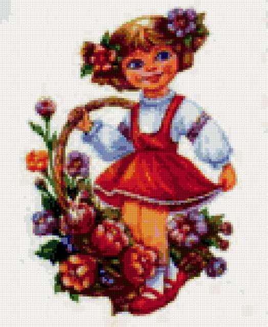 Ориентировочно так, схема вышивки «Машенька», созданная автором Juliy2802, будет выглядеть при отшиве на канве. Размер данной вышивки равен 123x150 крестов, при этом используется 53 цветов. Ключевые слова, по которым можно найти эту схему: девочка, дети, цветы, детская картинка. Также, вы можете взглянуть на оригинальную картинку, соответствующую данной схеме вышивки.