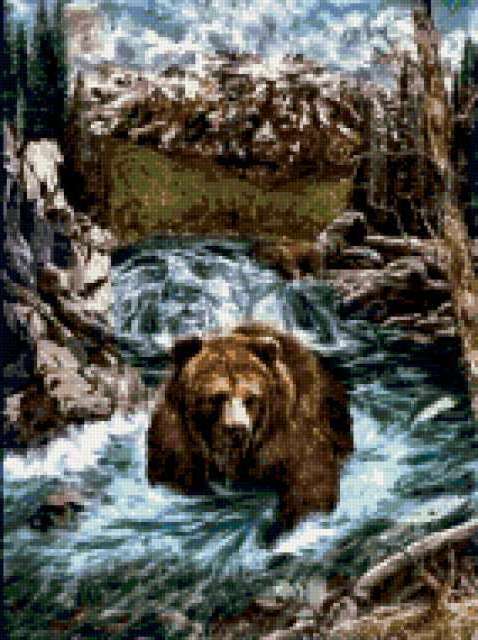 Ориентировочно так, схема вышивки «Медведь», созданная автором lv-sunflower, будет выглядеть при отшиве на канве. Размер данной вышивки равен 142x190 крестов, при этом используется 64 цветов. Ключевые слова, по которым можно найти эту схему: медведь, животные, природа. Также, вы можете взглянуть на оригинальную картинку, соответствующую данной схеме вышивки.