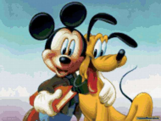 Ориентировочно так, схема вышивки «Микки-Маус и Плуто», созданная автором Melisenta, будет выглядеть при отшиве на канве. Размер данной вышивки равен 190x143 крестов, при этом используется 71 цветов. Ключевые слова, по которым можно найти эту схему: детям, сказка, дисней, мультик. Также, вы можете взглянуть на оригинальную картинку, соответствующую данной схеме вышивки.