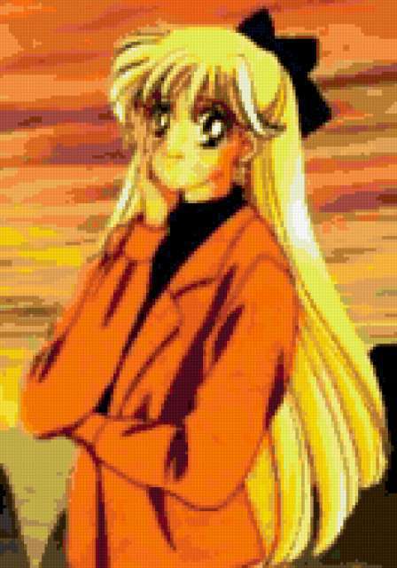 Ориентировочно так, схема вышивки «Минако», созданная автором vampirlady2009, будет выглядеть при отшиве на канве. Размер данной вышивки равен 133x190 крестов, при этом используется 40 цветов. Ключевые слова, по которым можно найти эту схему: минако, сейлор венера, сейлор воины, сейлор мун, девушка, картина, она, аниме. Также, вы можете взглянуть на оригинальную картинку, соответствующую данной схеме вышивки.