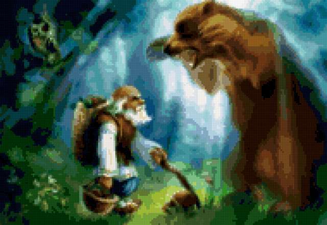 Ориентировочно так, схема вышивки «Михайло Потапыч», созданная автором emma-ia, будет выглядеть при отшиве на канве. Размер данной вышивки равен 190x131 крестов, при этом используется 72 цветов. Ключевые слова, по которым можно найти эту схему: сказка, детям, мишки. Также, вы можете взглянуть на оригинальную картинку, соответствующую данной схеме вышивки.