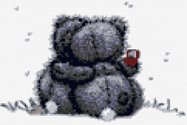 Ориентировочно так, схема вышивки «Мишка Тедди», созданная автором poltanya, будет выглядеть при отшиве на канве. Размер данной вышивки равен 121x81 крестов, при этом используется 12 цветов. Ключевые слова, по которым можно найти эту схему: мишки, медвежата, мишки тедди, детки, детские сюжеты, зверушки, игрушки, валентинка. Также, вы можете взглянуть на оригинальную картинку, соответствующую данной схеме вышивки.