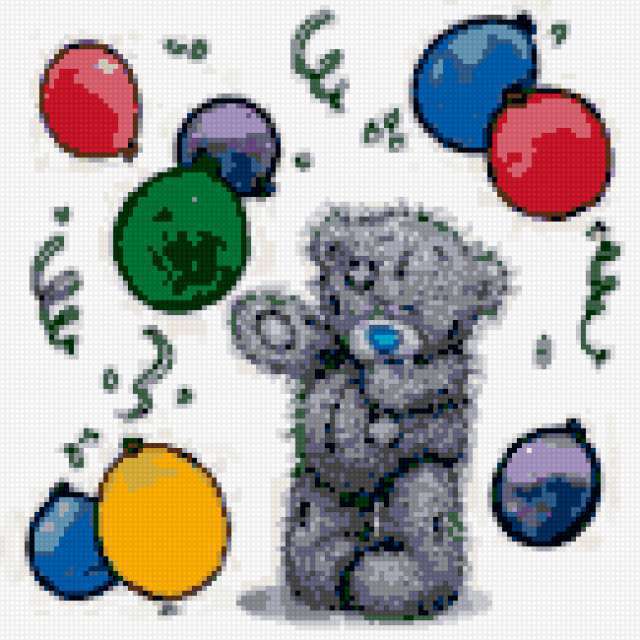 Ориентировочно так, схема вышивки «Мишка и шарики», созданная автором nizova, будет выглядеть при отшиве на канве. Размер данной вышивки равен 130x130 крестов, при этом используется 28 цветов. К несчастью, автор не назначил для схемы ключевые слова. Также, вы можете взглянуть на оригинальную картинку, соответствующую данной схеме вышивки.