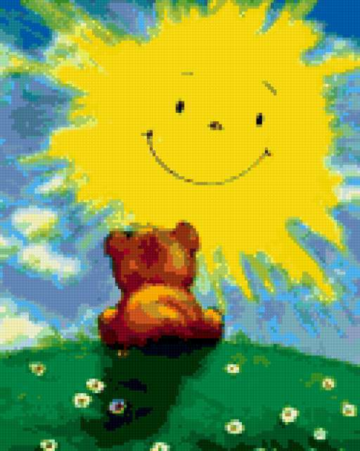 Ориентировочно так, схема вышивки «Мишка на лугу», созданная автором danarusnak, будет выглядеть при отшиве на канве. Размер данной вышивки равен 125x156 крестов, при этом используется 61 цветов. Ключевые слова, по которым можно найти эту схему: мультяшки. Также, вы можете взглянуть на оригинальную картинку, соответствующую данной схеме вышивки.