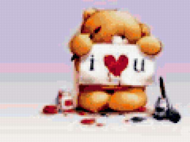 Ориентировочно так, схема вышивки «Мишка», созданная автором alina84, будет выглядеть при отшиве на канве. Размер данной вышивки равен 120x90 крестов, при этом используется 73 цветов. Ключевые слова, по которым можно найти эту схему: картинки, радость, мишка. Также, вы можете взглянуть на оригинальную картинку, соответствующую данной схеме вышивки.