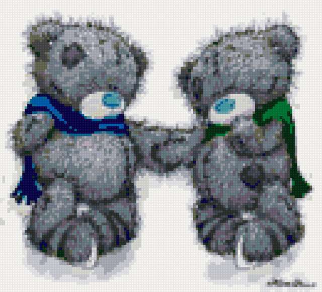 Ориентировочно так, схема вышивки «Мишки вместе», созданная автором nizova, будет выглядеть при отшиве на канве. Размер данной вышивки равен 130x118 крестов, при этом используется 29 цветов. К несчастью, автор не назначил для схемы ключевые слова. Также, вы можете взглянуть на оригинальную картинку, соответствующую данной схеме вышивки.