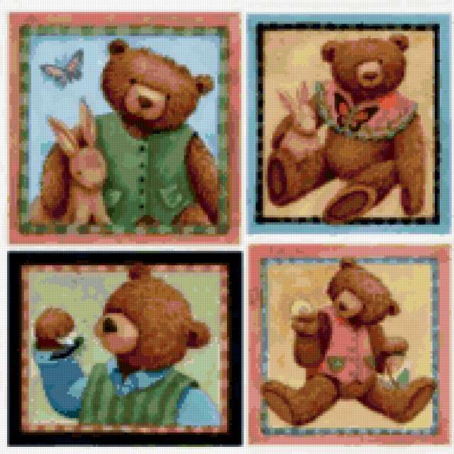 Ориентировочно так, схема вышивки «Мишки», созданная автором torik, будет выглядеть при отшиве на канве. Размер данной вышивки равен 190x190 крестов, при этом используется 80 цветов. Ключевые слова, по которым можно найти эту схему: подушки. Также, вы можете взглянуть на оригинальную картинку, соответствующую данной схеме вышивки.