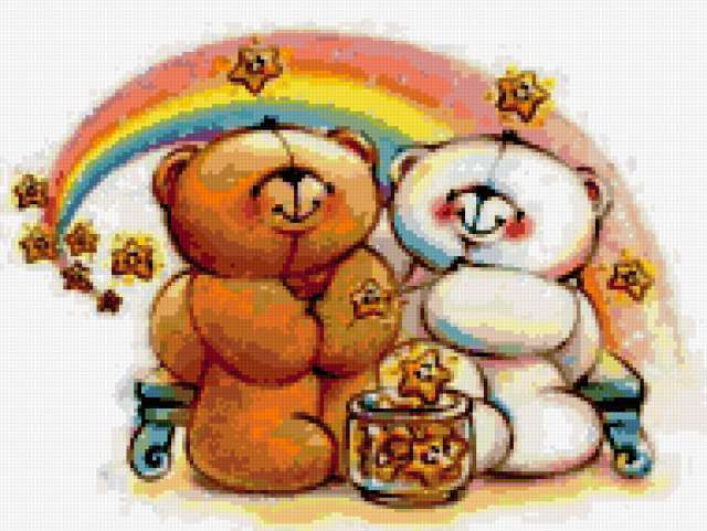 Ориентировочно так, схема вышивки «Мишки», созданная автором alenenok08, будет выглядеть при отшиве на канве. Размер данной вышивки равен 190x143 крестов, при этом используется 52 цветов. Ключевые слова, по которым можно найти эту схему: мишки, дружба, игрушки, детям. Также, вы можете взглянуть на оригинальную картинку, соответствующую данной схеме вышивки.