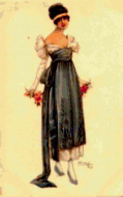 Ориентировочно так, схема вышивки «Модница», созданная автором Fardo, будет выглядеть при отшиве на канве. Размер данной вышивки равен 119x190 крестов, при этом используется 63 цветов. Ключевые слова, по которым можно найти эту схему: женщина, леди, дама, девушка. Также, вы можете взглянуть на оригинальную картинку, соответствующую данной схеме вышивки.
