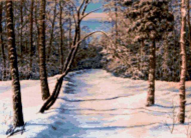 Ориентировочно так, схема вышивки «Мороз и солнце», созданная автором rybka6, будет выглядеть при отшиве на канве. Размер данной вышивки равен 190x138 крестов, при этом используется 55 цветов. Ключевые слова, по которым можно найти эту схему: пейзаж, природа, зима, дорога, снег, закат, багряный, лес, мороз, иней, лес, ёлка, деревня, домик, картина, живопись, искусство. Также, вы можете взглянуть на оригинальную картинку, соответствующую данной схеме вышивки.