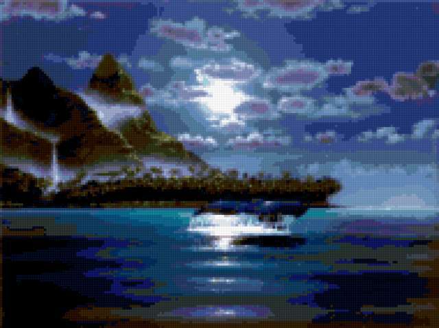 Ориентировочно так, схема вышивки «Морской пейзаж», созданная автором Elena_, будет выглядеть при отшиве на канве. Размер данной вышивки равен 190x142 крестов, при этом используется 59 цветов. Ключевые слова, по которым можно найти эту схему: пейзаж, море, кит, ночь, луна, фэнтэзи, горы, водопад. Также, вы можете взглянуть на оригинальную картинку, соответствующую данной схеме вышивки.