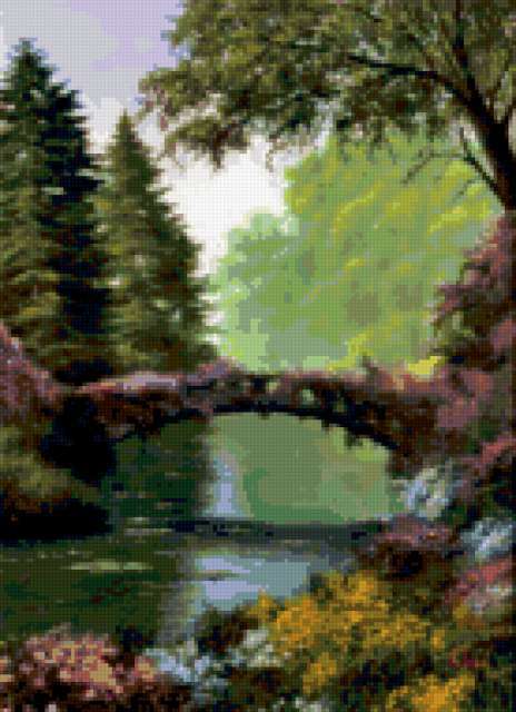 Ориентировочно так, схема вышивки «Мостик», созданная автором vesnyshka63, будет выглядеть при отшиве на канве. Размер данной вышивки равен 138x190 крестов, при этом используется 76 цветов. Ключевые слова, по которым можно найти эту схему: пейзаж, живопись, река, мост. Также, вы можете взглянуть на оригинальную картинку, соответствующую данной схеме вышивки.