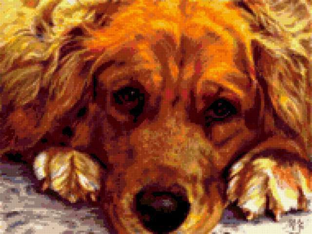 Ориентировочно так, схема вышивки «Мохнатый друг», созданная автором lipo4ka, будет выглядеть при отшиве на канве. Размер данной вышивки равен 190x143 крестов, при этом используется 66 цветов. Ключевые слова, по которым можно найти эту схему: животные, собаки. Также, вы можете взглянуть на оригинальную картинку, соответствующую данной схеме вышивки.