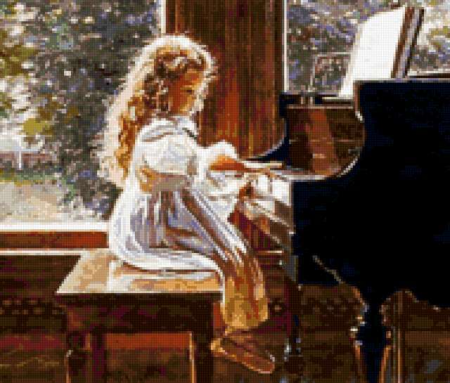 Ориентировочно так, схема вышивки «Музыка», созданная автором kolst, будет выглядеть при отшиве на канве. Размер данной вышивки равен 190x162 крестов, при этом используется 70 цветов. Ключевые слова, по которым можно найти эту схему: девочка.дети.ребенок, пианино. Также, вы можете взглянуть на оригинальную картинку, соответствующую данной схеме вышивки.