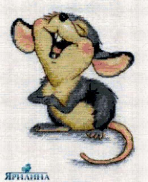Ориентировочно так, схема вышивки «Мышка смеется», созданная автором belyanka, будет выглядеть при отшиве на канве. Размер данной вышивки равен 155x190 крестов, при этом используется 74 цветов. Ключевые слова, по которым можно найти эту схему: животные, детское, мышь. Также, вы можете взглянуть на оригинальную картинку, соответствующую данной схеме вышивки.